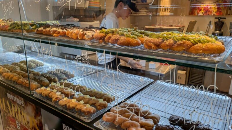 ショーケースにたくさんの長細ドーナツが並んでいますのでお好きなドーナツを選びましょう。