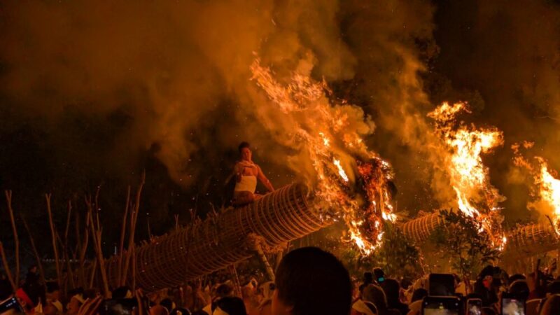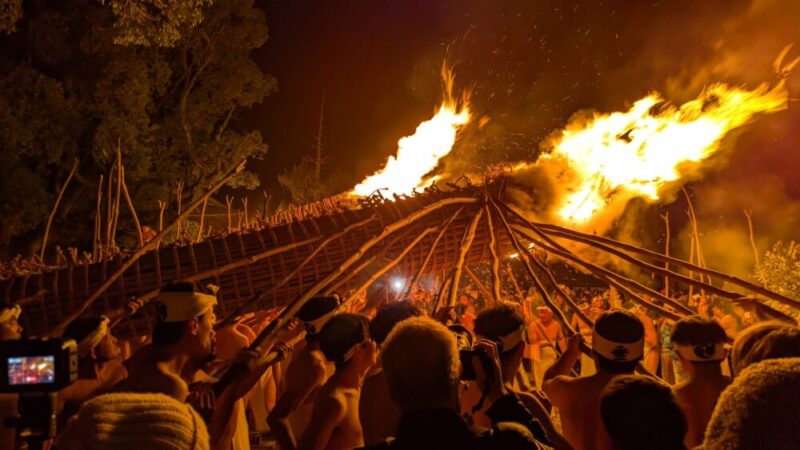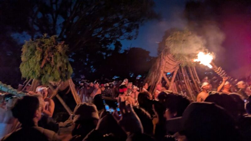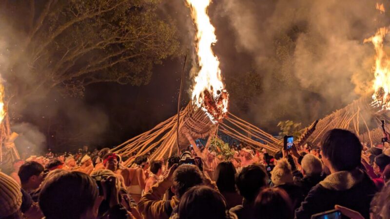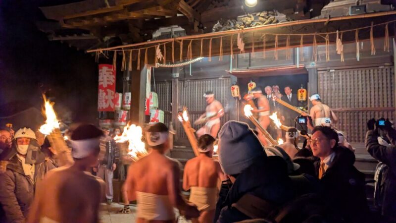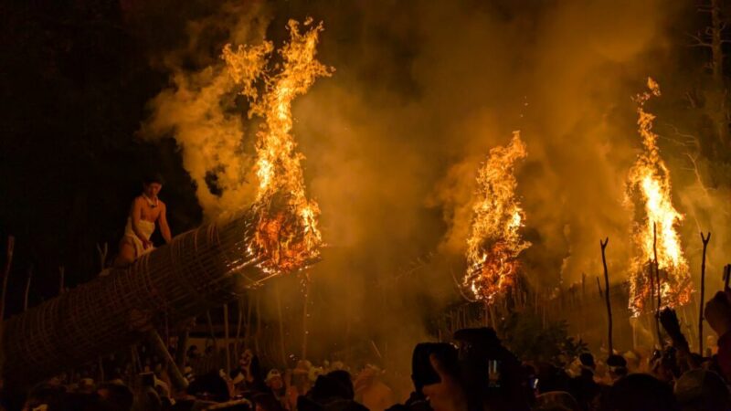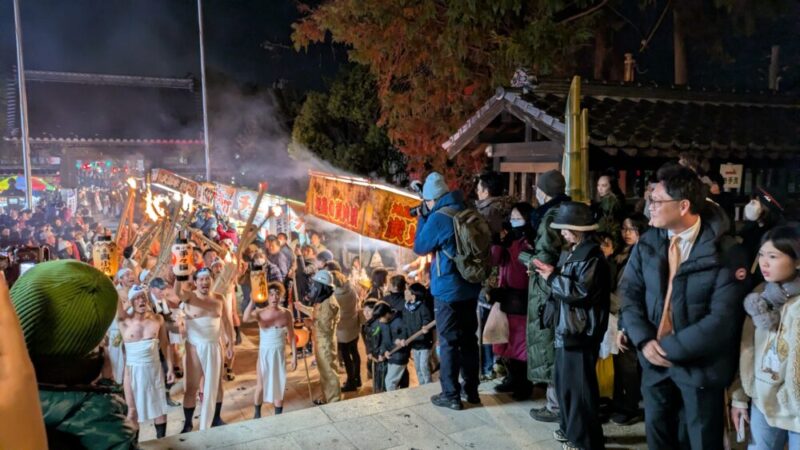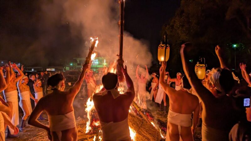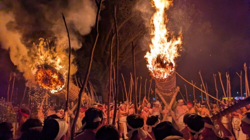 最大のハイライトは、夜に点火される「大松明」。全長約13メートル、重さ約1.2トンもの巨大な松明6本が、締め込み姿の男衆によって支えられ、火の粉を散らしながら神殿の周囲を回る。この火を浴びると無病息災が得られると言い伝えられており、降り注ぐ火の粉の中を突き進む姿は圧巻の迫力。