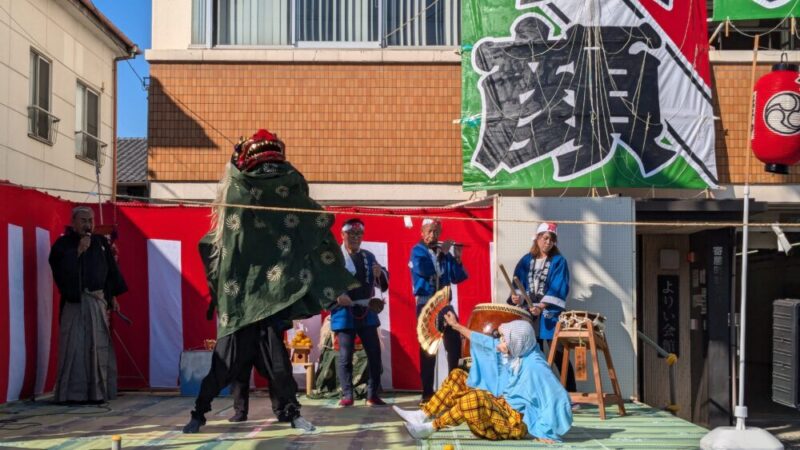 市街地通りでは山車やちびっ子の行進の他にも獅子舞が行われていました。