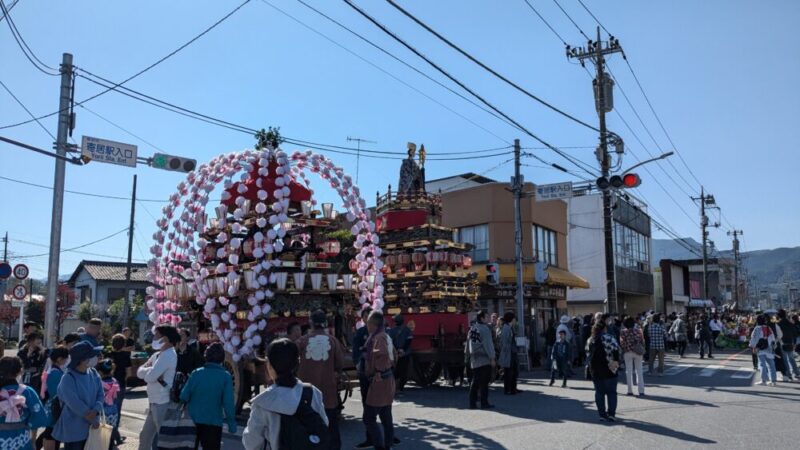| 【概要】 江戸時代から続く伝統的なお祭り。寄居町の総鎮守である寄居八幡宮の例大祭として行われ、五穀豊穣を感謝し、町の繁栄を願う。 最大の見どころは、絢爛豪華な山車の巡行。寄居市街( 本町から武町の間) が歩行者天国となり、本町、中町、栄町、武町、茅町、宮本、常木の歴史ある山車7台の曳きまわしを行う。彫刻や装飾が施された山車が町内を練り歩き、祭りの雰囲気を盛り上げる。夜には提灯の明かりが山車を照らし出し、幻想的な光景が広がる。 山車の巡行に加え、神輿の渡御、お囃子の演奏、そして町民による露店なども祭りの活気を彩る。地元の方々はもちろん、遠方からも多くの観光客が訪れ、寄居の秋を彩る一大イベントとして親しまれている。 | |